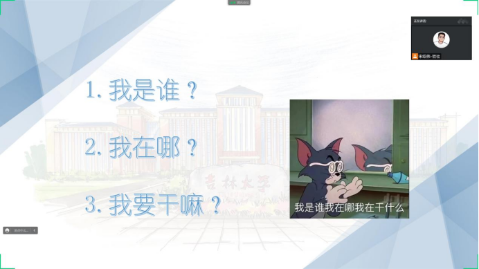 宋老师以风趣幽默的语言开启了本次校园生活分享,用“我是谁?”“我在哪儿?”“我要干嘛?”三个问题作为开场,向同学们介绍了自己的基本情况以及办公地点,并归纳辅导员可以为同学们解决的问题类型,希望同学们遇到困扰及时联系自己。