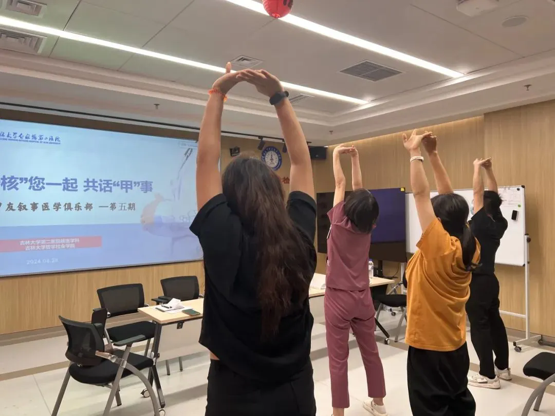 核医学科王丽波老师和甲友一起打八段锦,释放心理压力。