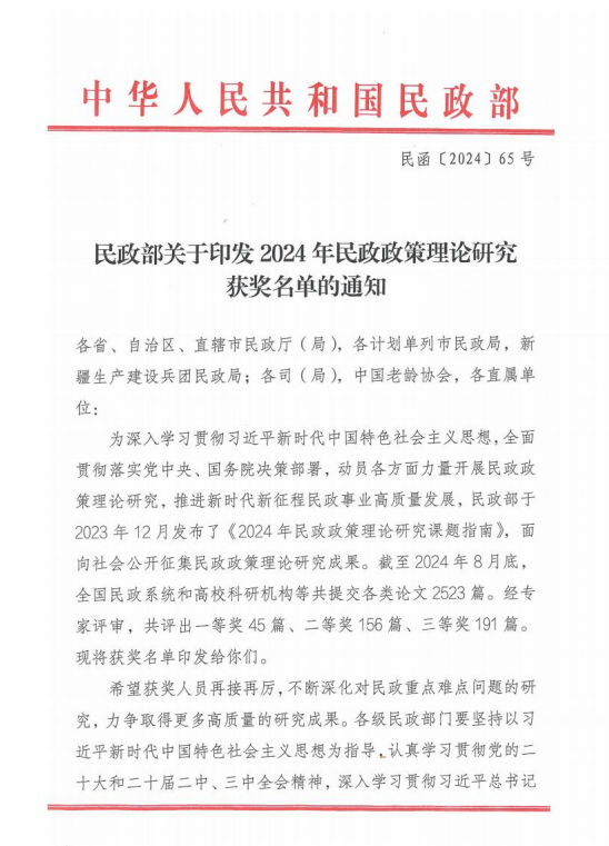 为深入学习贯彻习近平新时代中国特色社会主义思想,全面贯彻落实党中央、国务院决策部署,动员各方面力量开展民政政策理论研究,推进新时代新征程民政事业高质量发展,民政部于2023年12月发布了《2024年民政政策理论研究课题指南》,面向社会公开征集民政政策理论研究成果。本院员工积极参与此次活动。2024年11月1日,中华人民共和国民政部发布了关于印发2024年民政政策力量研究获奖名单的通知,304永利集团2017级社会学专业博士研究生徐莉、成彦提交的文章《中国式现代化背景下现代公墓业发展路径研究》荣获三等奖。
