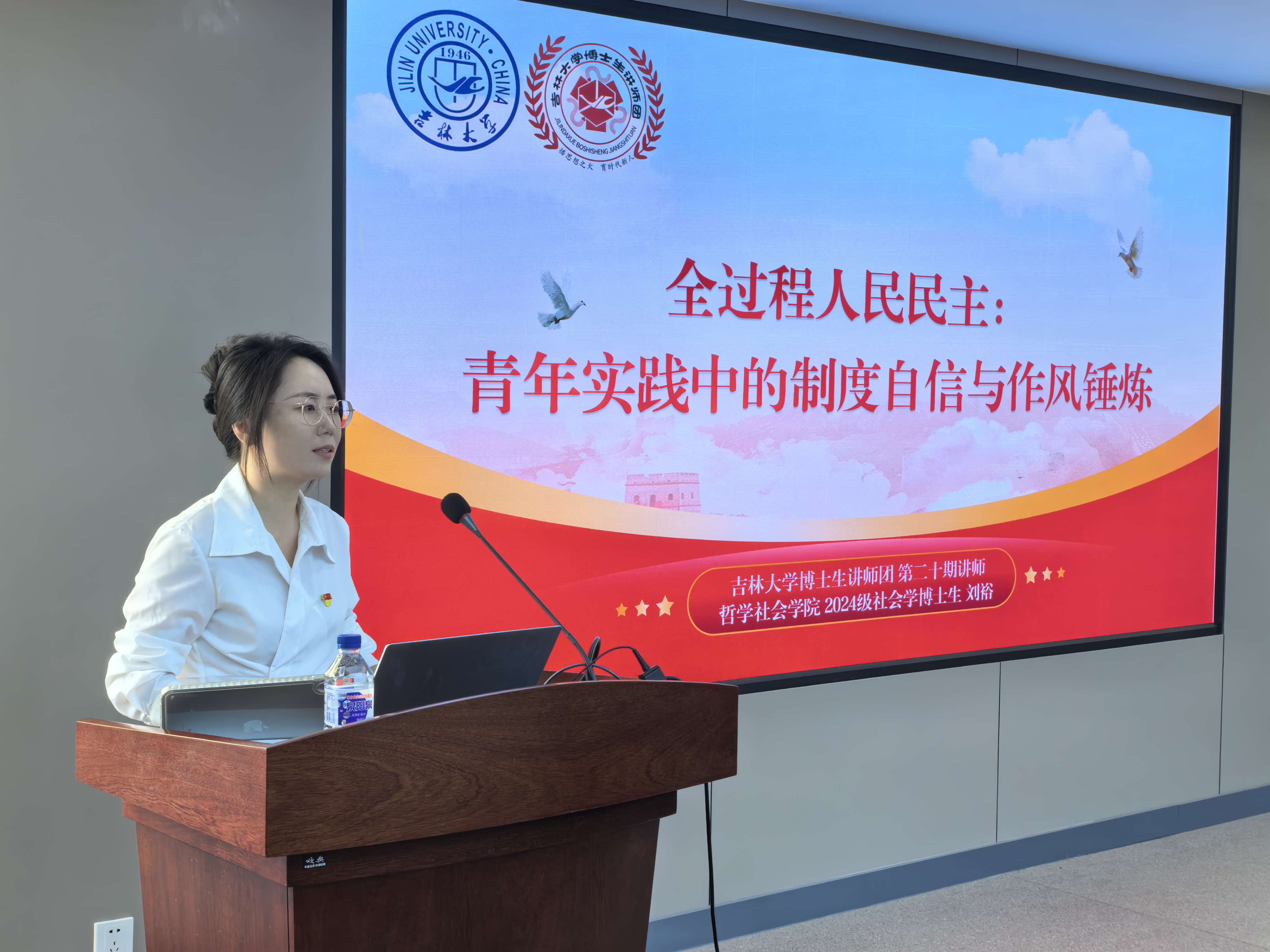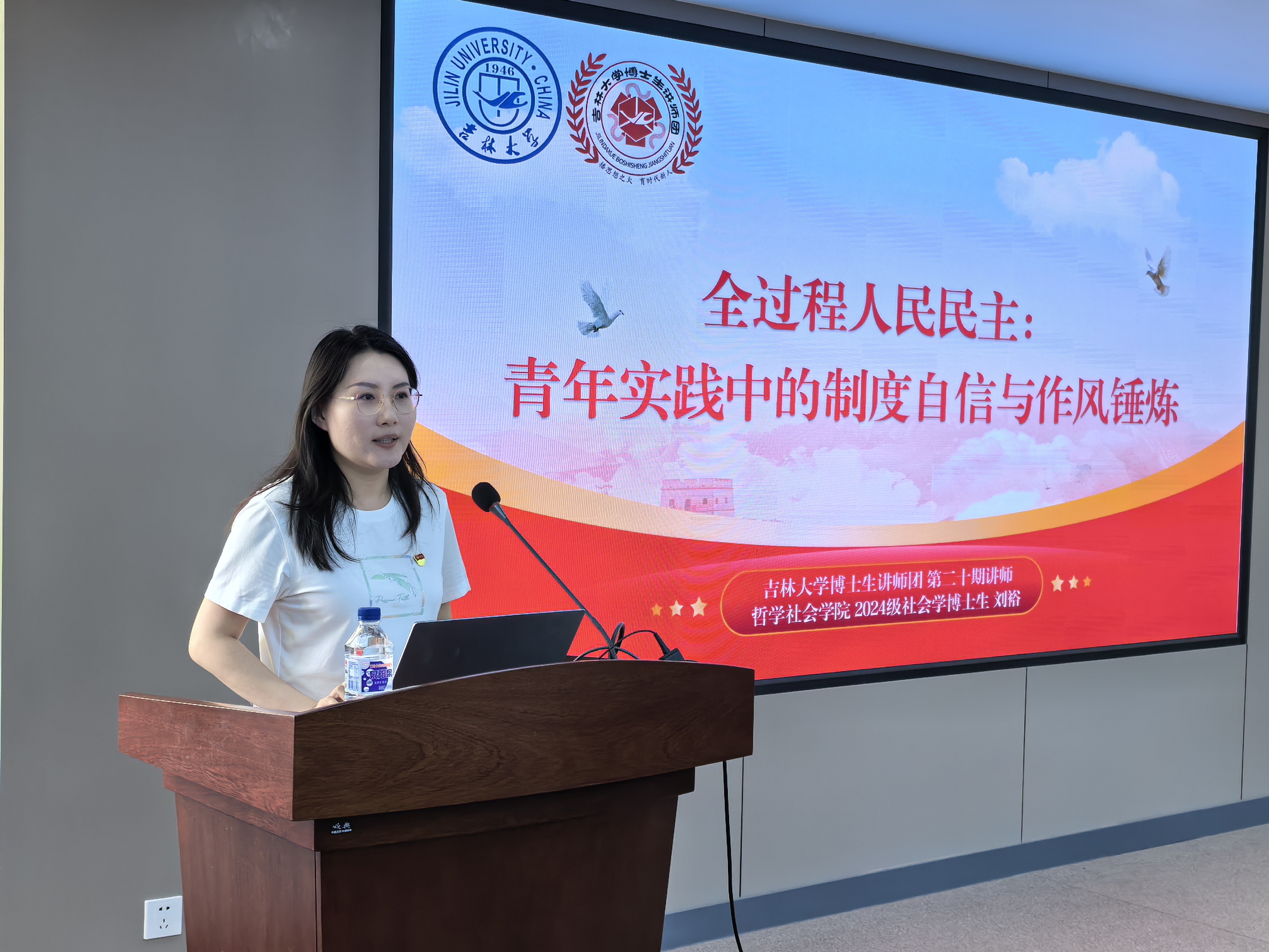 刘裕同学从全过程人民民主溯源开始,回顾了习近平总书记对全过程人民民主的系统阐述,并通过对全过程人民民主形成脉络的梳理,生动展现其贯穿国家政治生活全方面的特质。针对青年关切领域,她列举公平就业、低碳转型等民主实践创新,展示了在新兴领域青年参与全过程人民民主的广阔空间,激发青年在民主实践中的使命担当。
