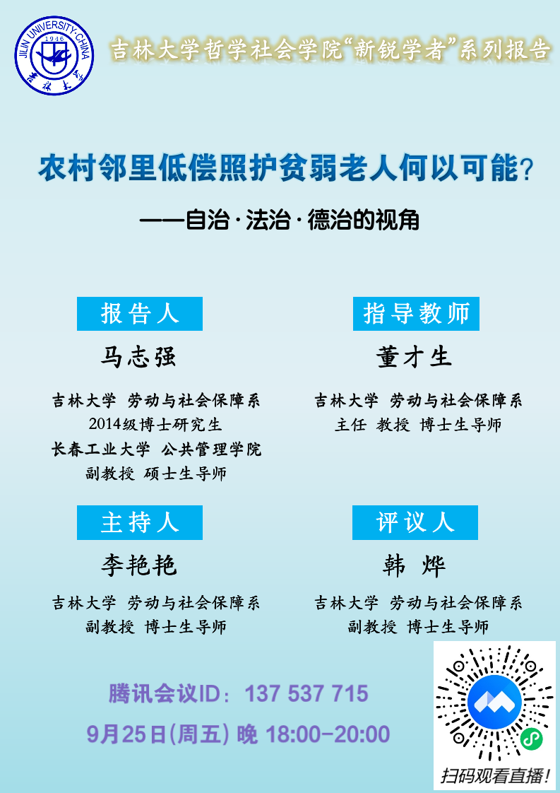 “新锐学者”系列报告--《农村邻里低偿照护贫弱老人何以可能?》--自治、法治、德治的视角(马志强)