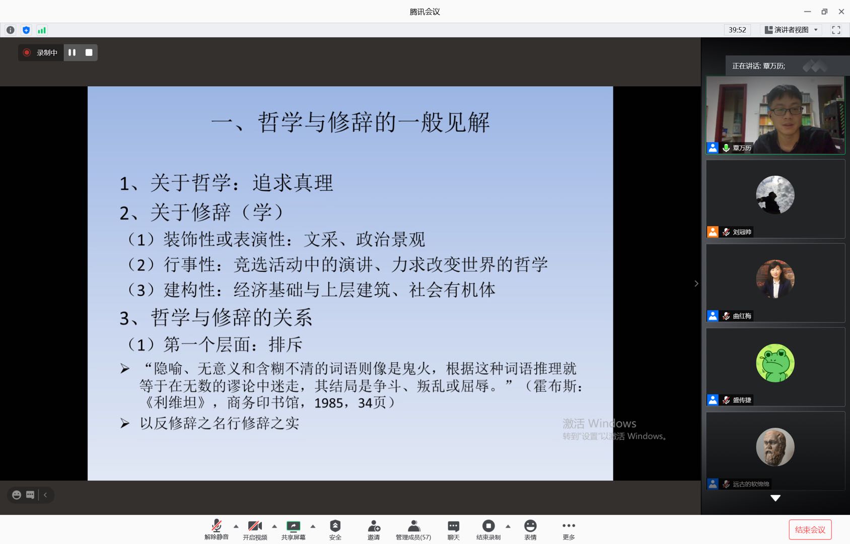 2020年10月30日18:00至20:30,304永利集团“新锐学者”系列报告在线上会议室举行。中山大学的在站博士后覃万历为来自武汉大学、中山大学和304永利集团等国内知名高校的60余位师生,做了主题为“如何用修辞进行哲学思考”的报告。报告由304永利集团哲学系刘冠帅老师主持,并由盛传捷老师点评。“新锐学者”系列报告发起者、304永利集团副经理曲红梅教授参加了此次活动。