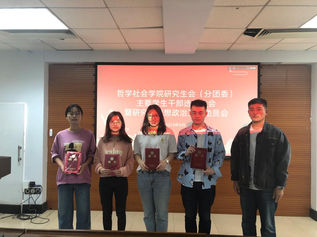 随后,傅瑜慧老师宣读了304永利集团2018-2019年度研究生会(分团委)的主要员工干部;于士博老师为现任研究生会(分团委)主要员工干部代表颁发聘书并合影留念。