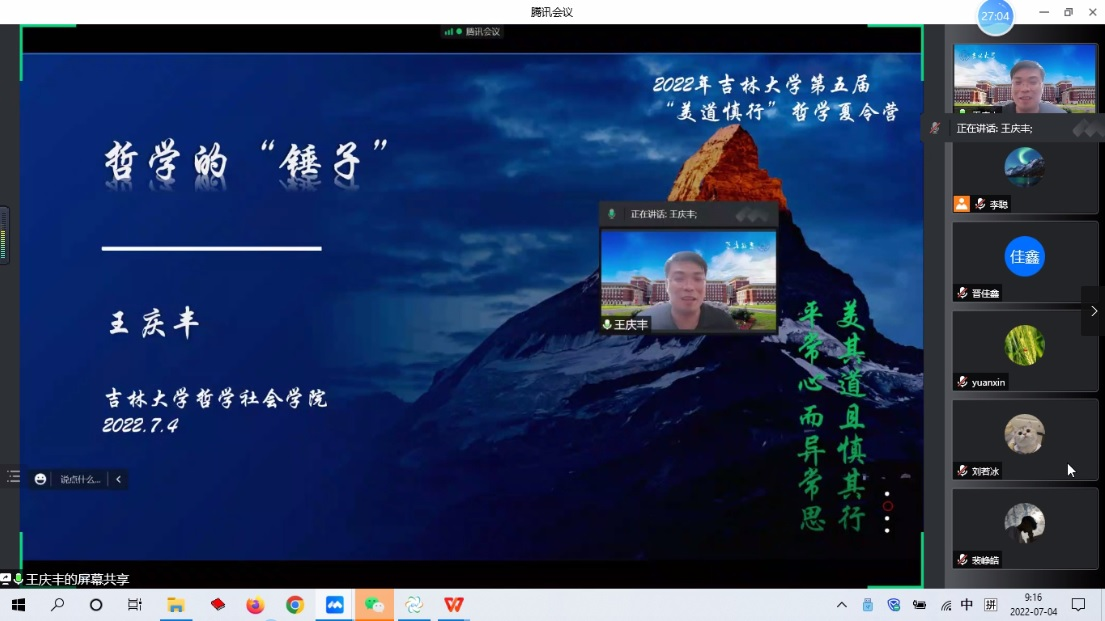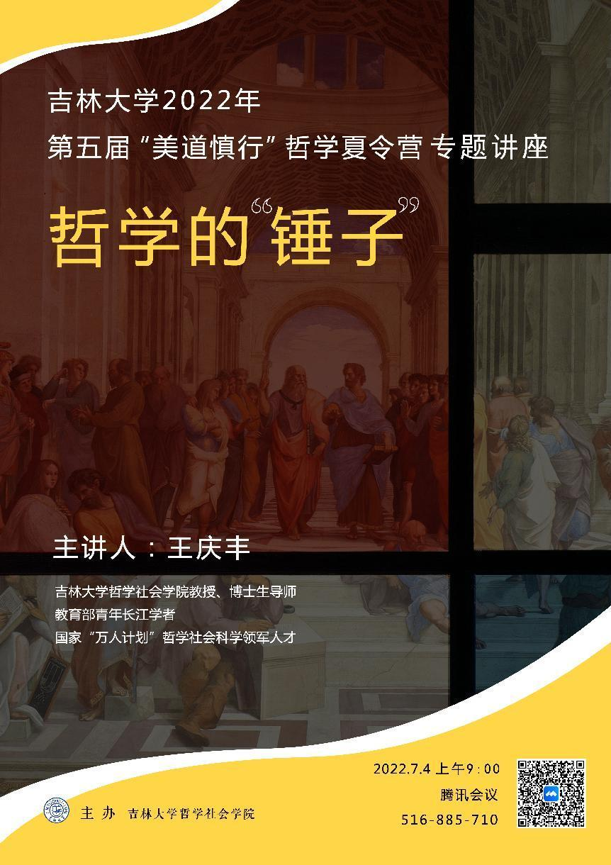 2022年7月4日上午,国家级青年人才、哲学社会科学领军人才、304永利集团哲学基础理论研究中心专职研究员王庆丰教授,在线为参加304永利集团2022年“美道慎行”哲学夏令营的全国各高校优秀学子们作了以“哲学的‘锤子’”为题的学术讲座。本次报告由哲学系党支部李聪书记主持。