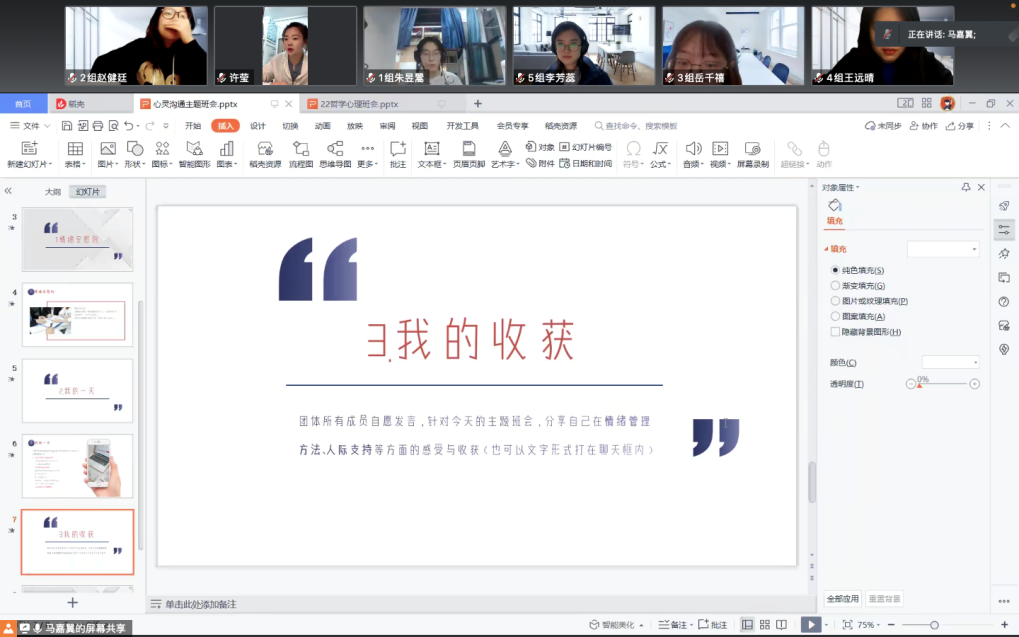 活动开始,由主持人介绍活动环节。活动通过“摇摆时钟”、“情绪安慰剂”、“不烦躁的理由”、“我的一天”、“见证彼此”和“我的收获”六个环节,使同学们充分参与进来,展开积极互动和热烈讨论。
