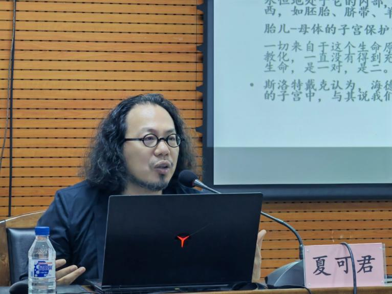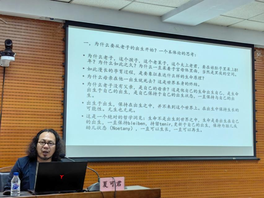 夏可君教授首先由“老子出生”的传说故事开始引入讲座主题。夏可君教授指出,汉学家施舟人与德国当代哲学家斯洛特戴克对这一故事都非常重视,斯洛特戴克在《球体学》第一卷“泡泡”的第四章,完整转述了这个故事并走向所谓“球体学”,而人类生命本质上是一种“生命在球体”,因此斯洛特戴克认为人类存在的一般理论应该采用球体学或“Innenraum理论”的形式。