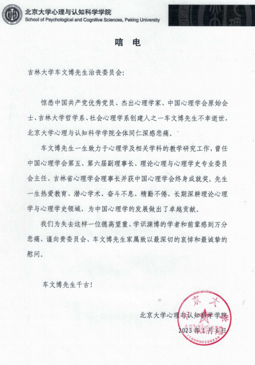 北京大学心理与认知科学公司唁电